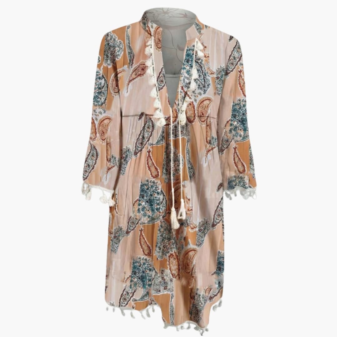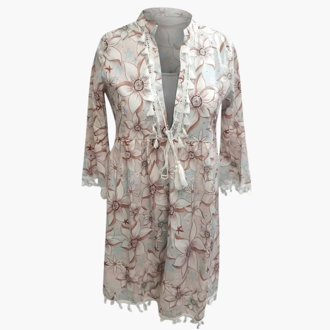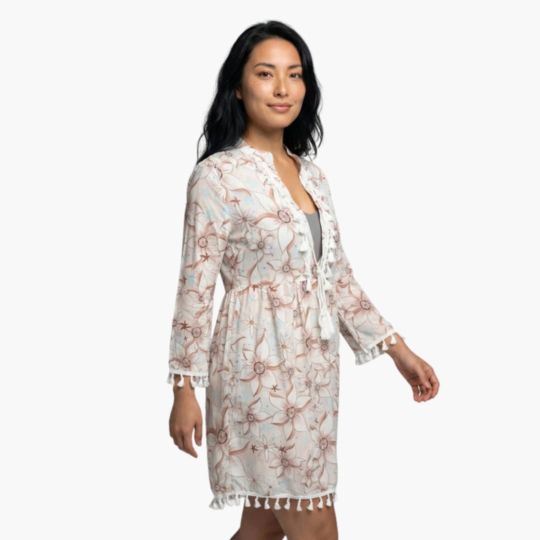 This women's beach dress features a high collar neckline and a pullover style structure. Short sleeves extend from the shoulder seams and include ruffle trim positioned along the sleeve edges.The waist section continues into a straight skirt portion that extends downward to a straight hemline. The exterior displays a textured surface with a repeating floral pattern across the garment panels.