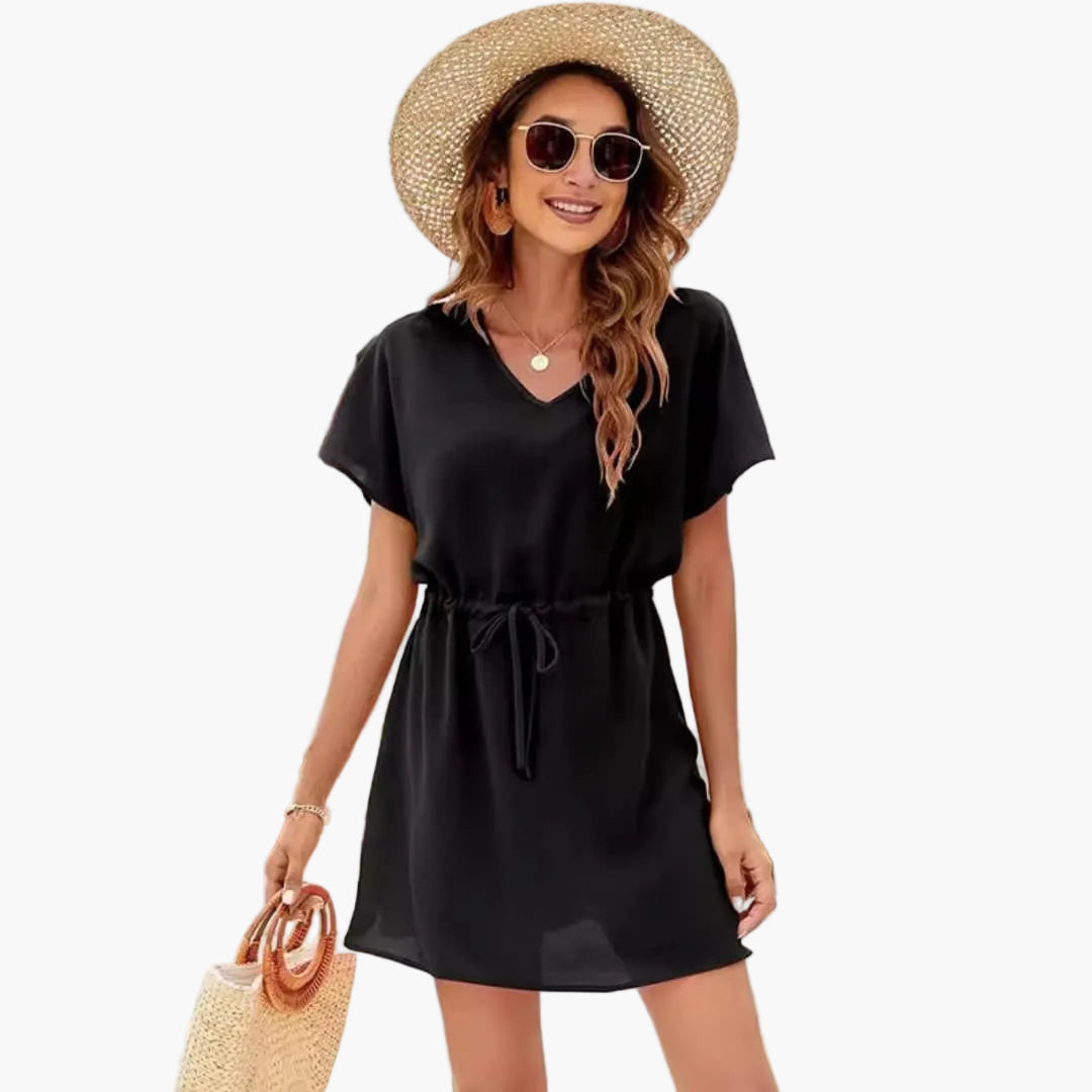 Beach dress designed with a V neckline and drawstring waist