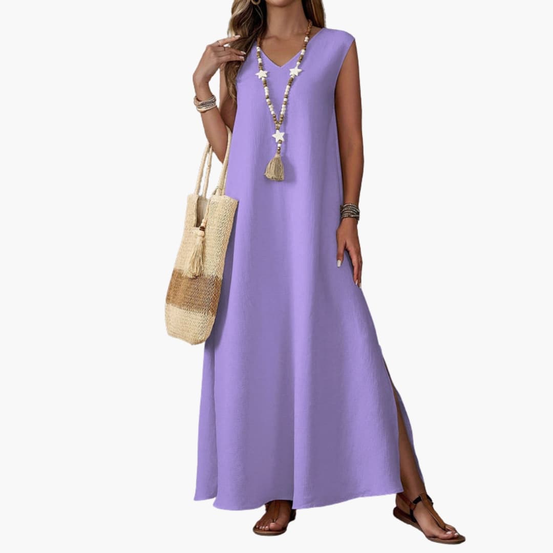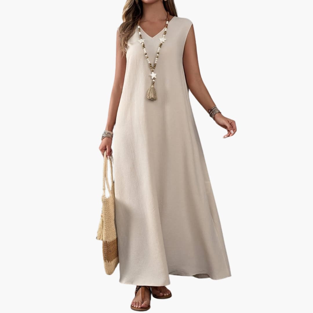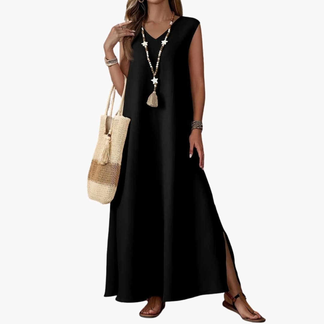 This women's maxi dress features a V neckline and a pullover style structure. Sleeveless shoulder straps connect the front and back panels, forming the upper section of the garment.The bodice section joins a waist seam that continues into a long skirt portion extending toward an ankle length hemline.