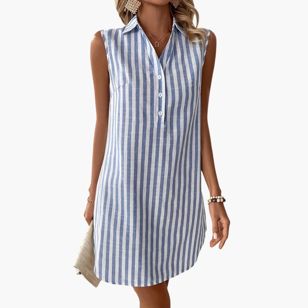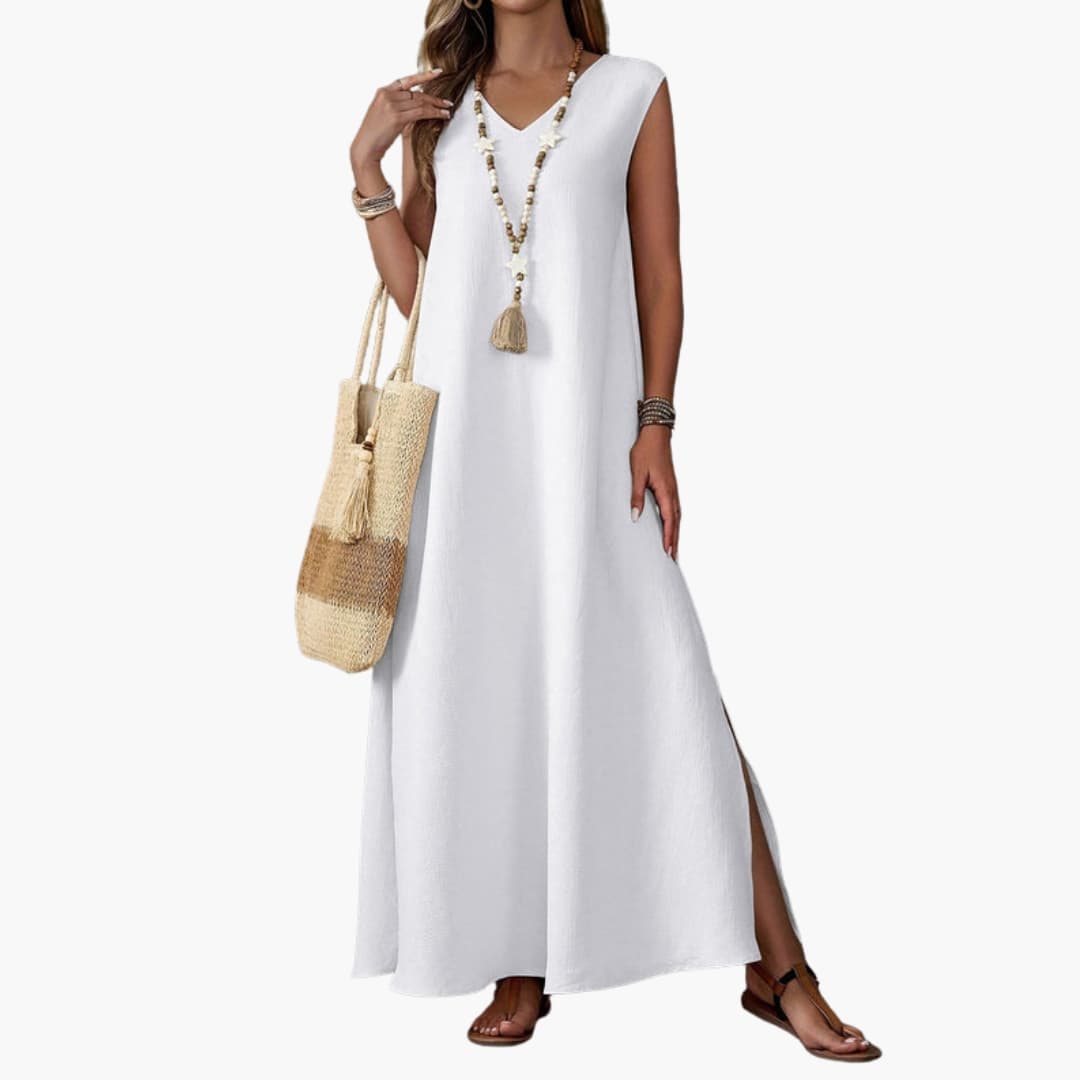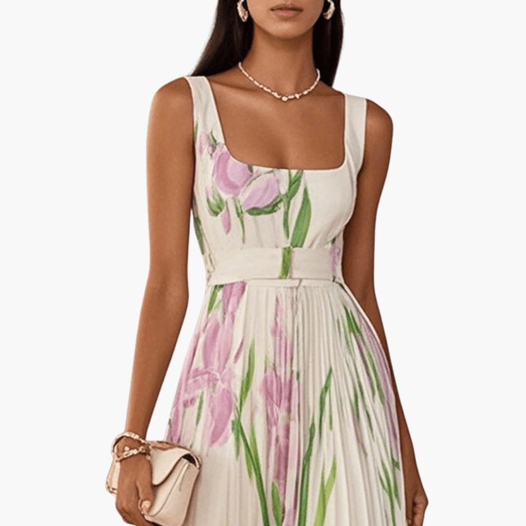 This midi dress features a structured neckline and a sleeveless design with a fitted bodice. The waist is defined to shape the fit, flowing into an A-line skirt. Discreet side pockets are included, and the fabric displays a smooth satin surface throughout.