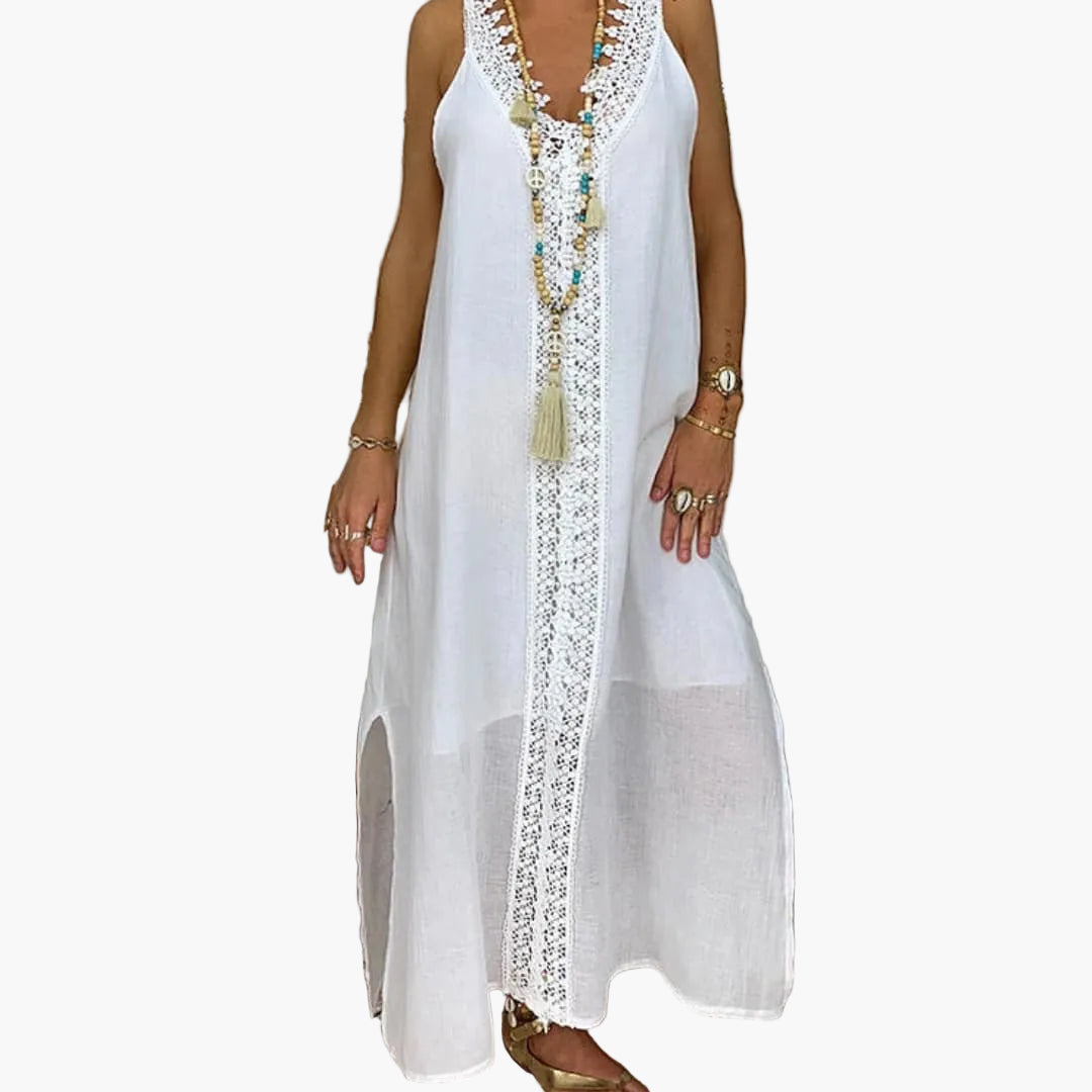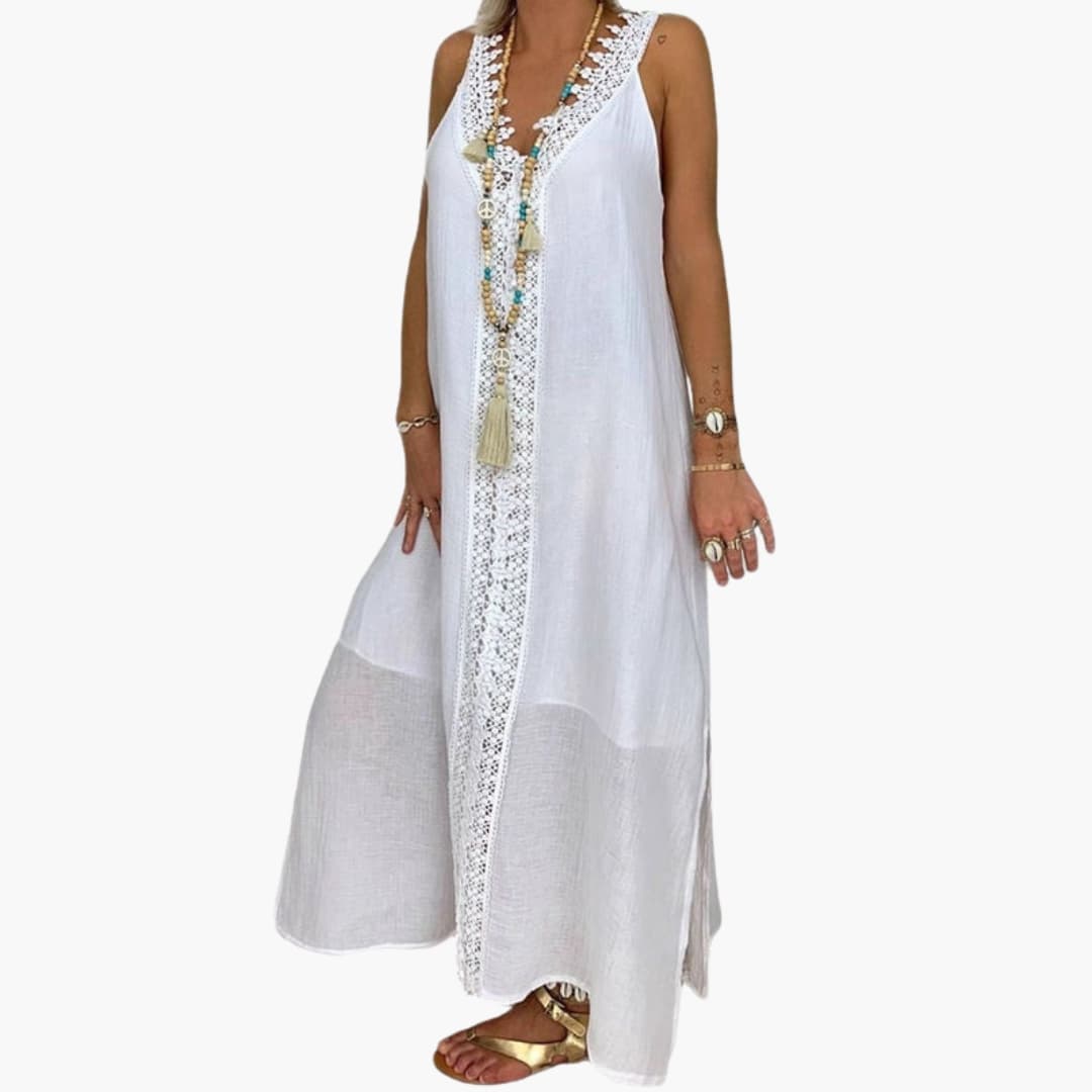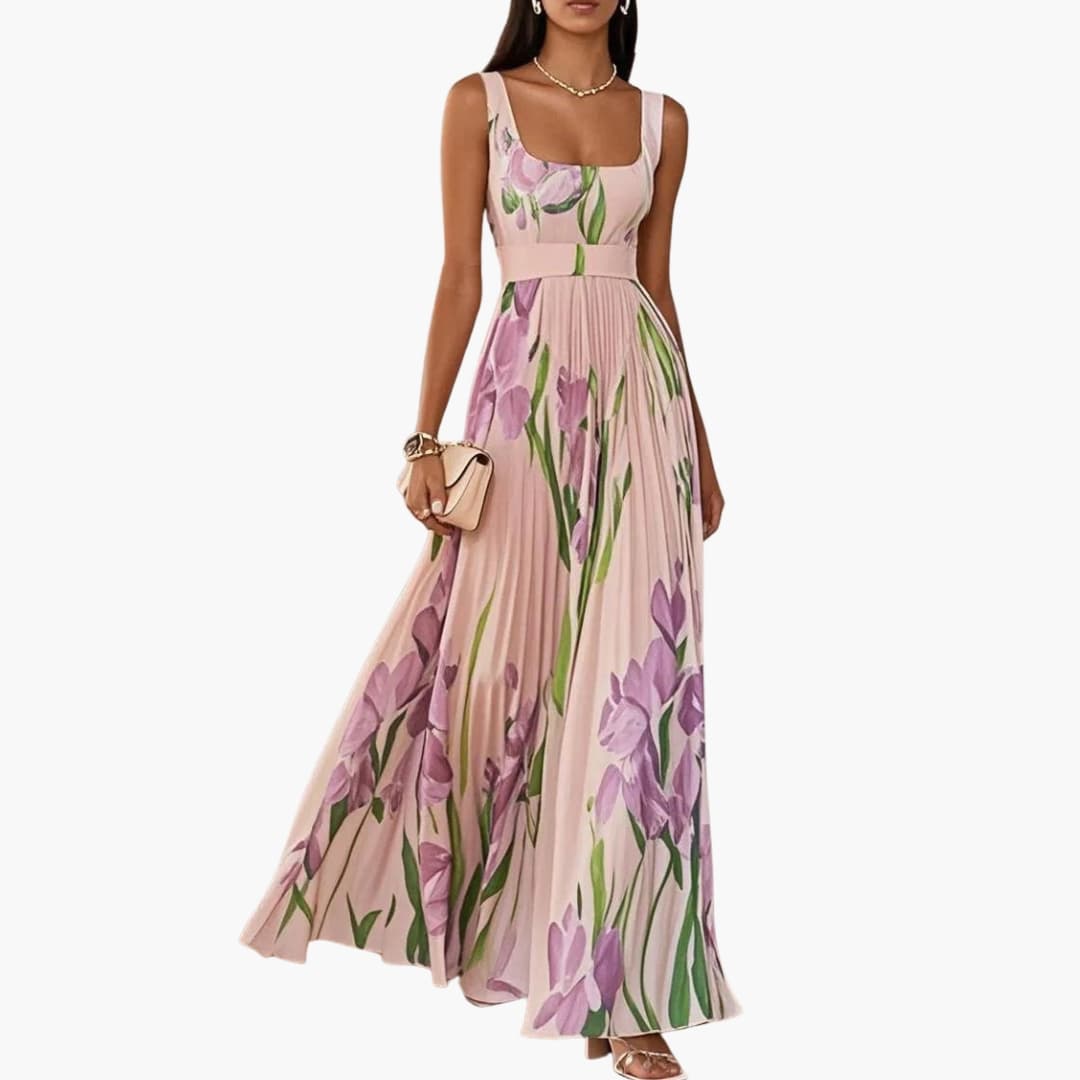 This midi dress features a structured neckline and a sleeveless design with a fitted bodice. The waist is defined to shape the fit, flowing into an A-line skirt. Discreet side pockets are included, and the fabric displays a smooth satin surface throughout.