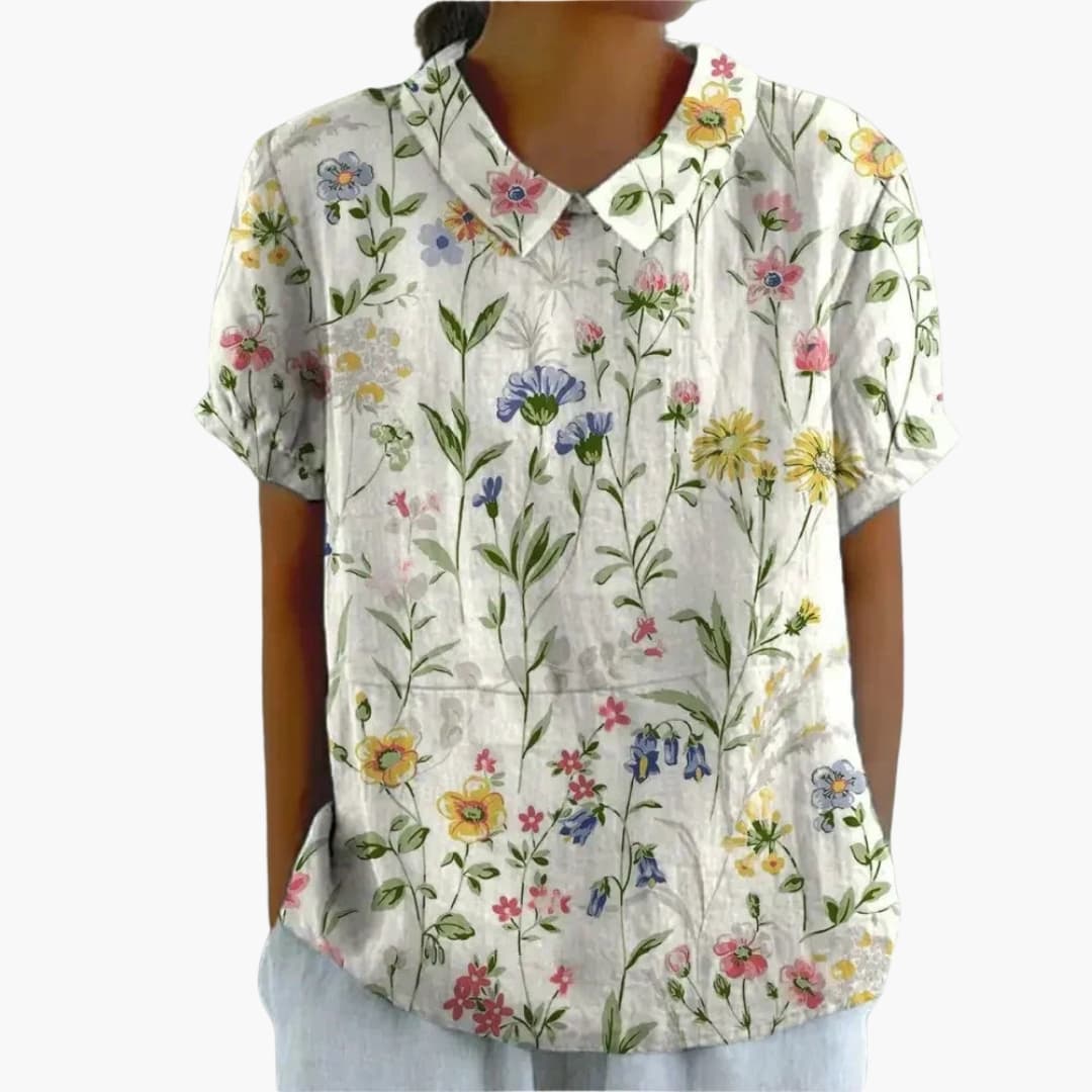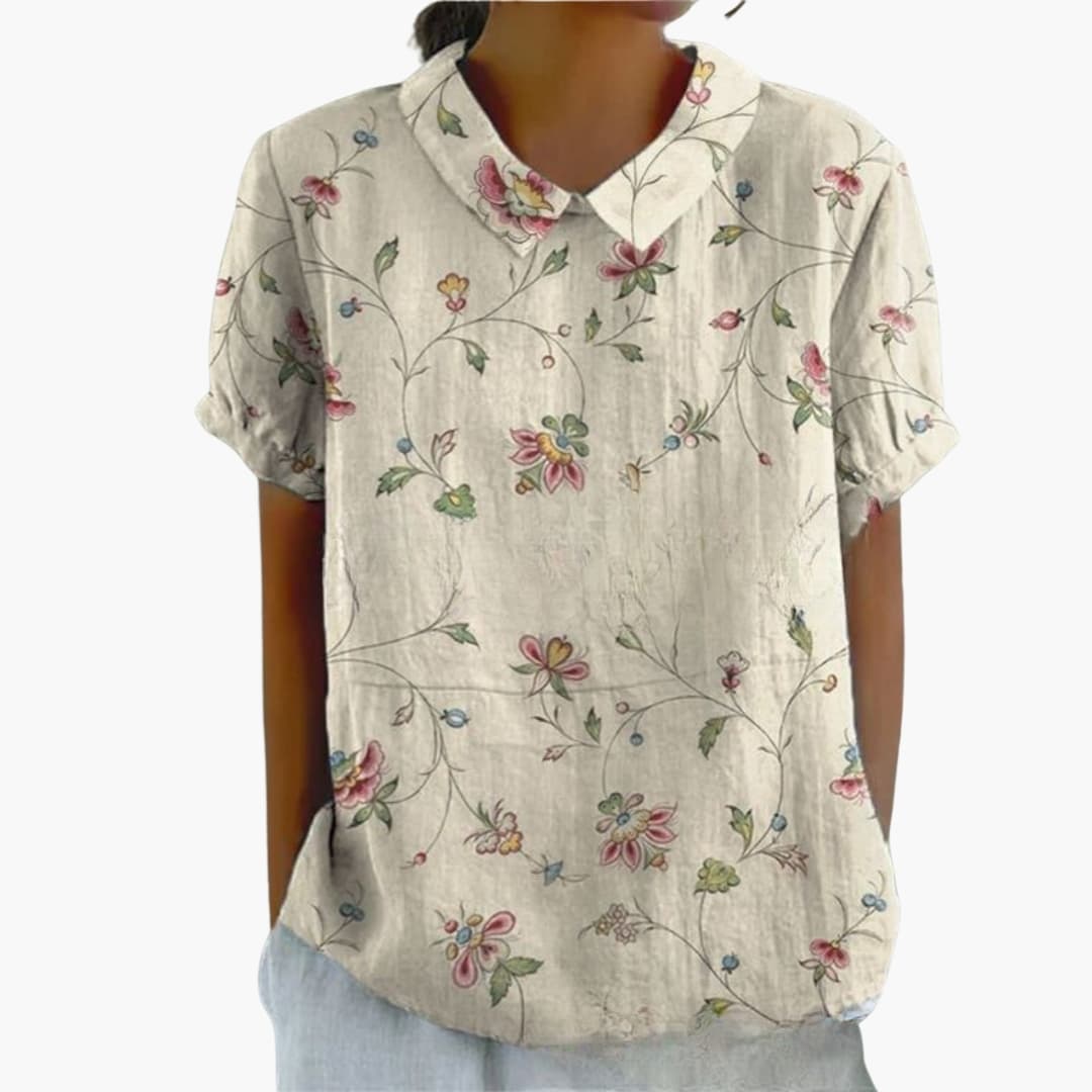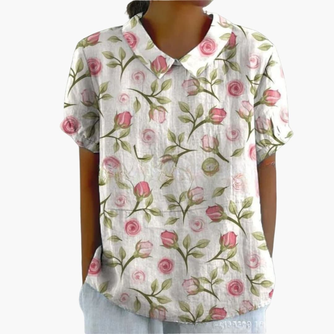 This women’s shirt features a collared neckline and a full button-down front closure. The long sleeves include structured cuffs, and the design follows a loose fit through the body. The hip-length cut creates a balanced outline, while the printed surface adds visual detail across the design. This shirt is suitable for daily and work-related use.