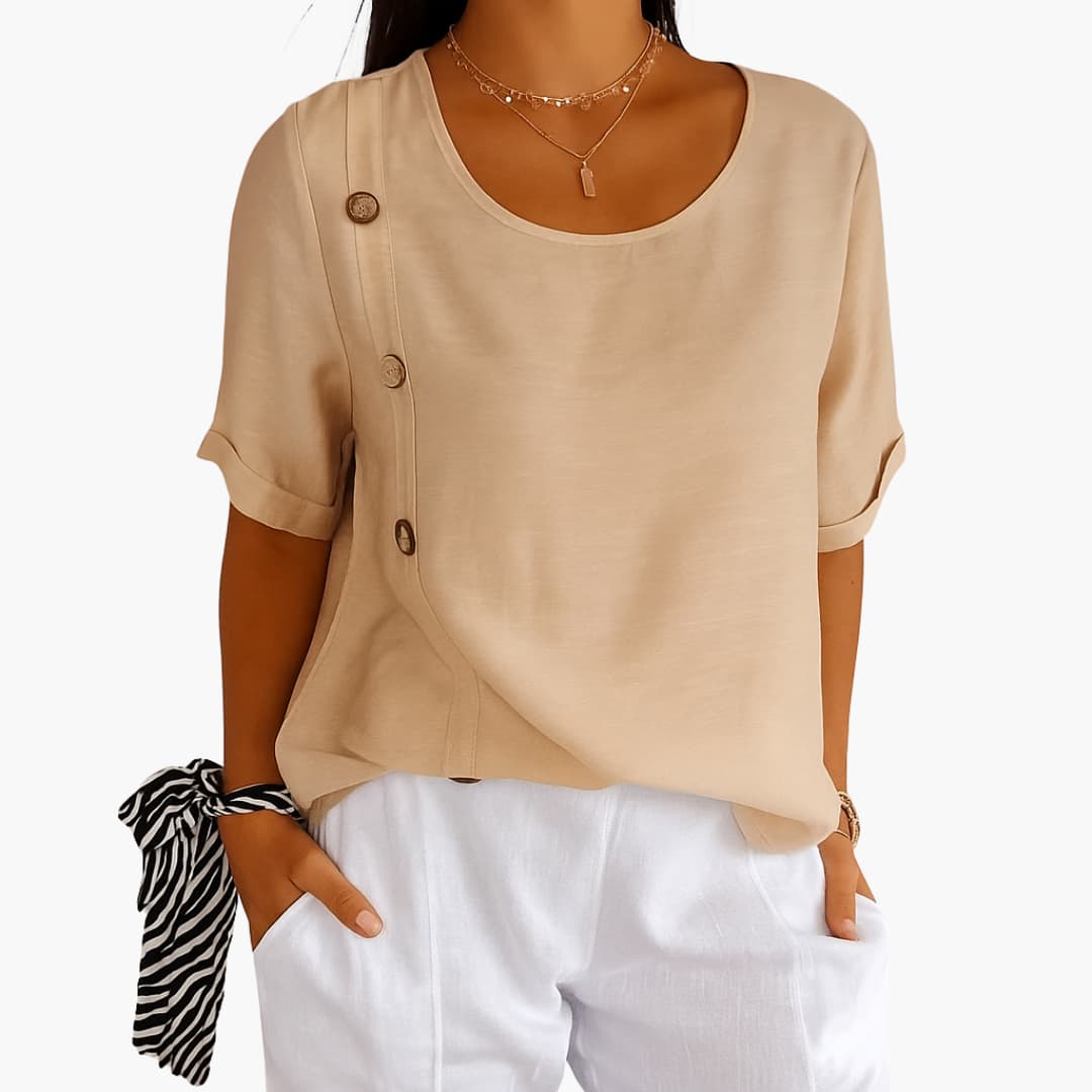 Women's blouse made from lightweight fabric, suitable for year-round wear. Designed with short sleeves and rolled hems, this top features a round neckline and side button details. The loose fit allows for easy pairing with casual or semi-formal bottoms. Ideal for everyday use, the office, or casual occasions throughout the year.