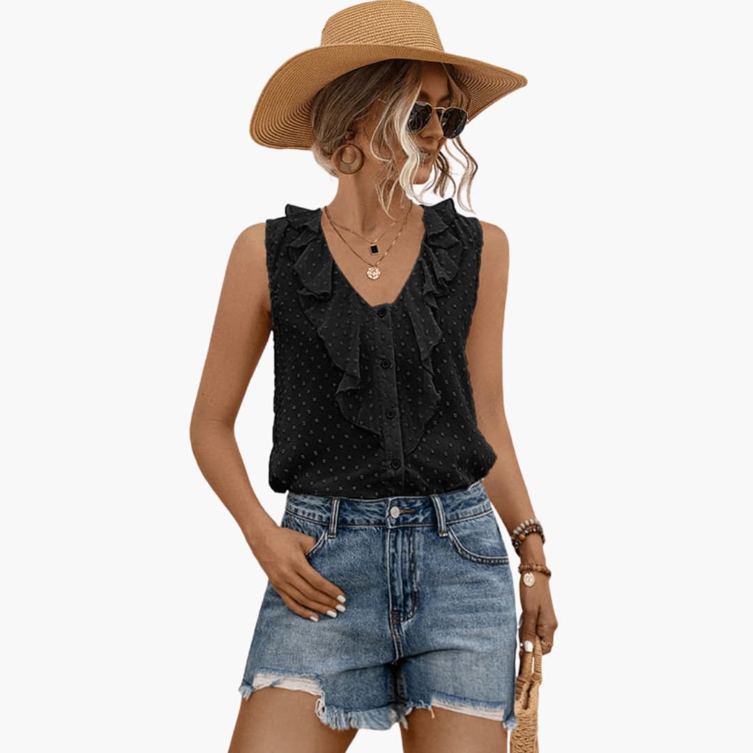 Sleeveless women's blouse featuring a V-neckline with ruffle trim and button front