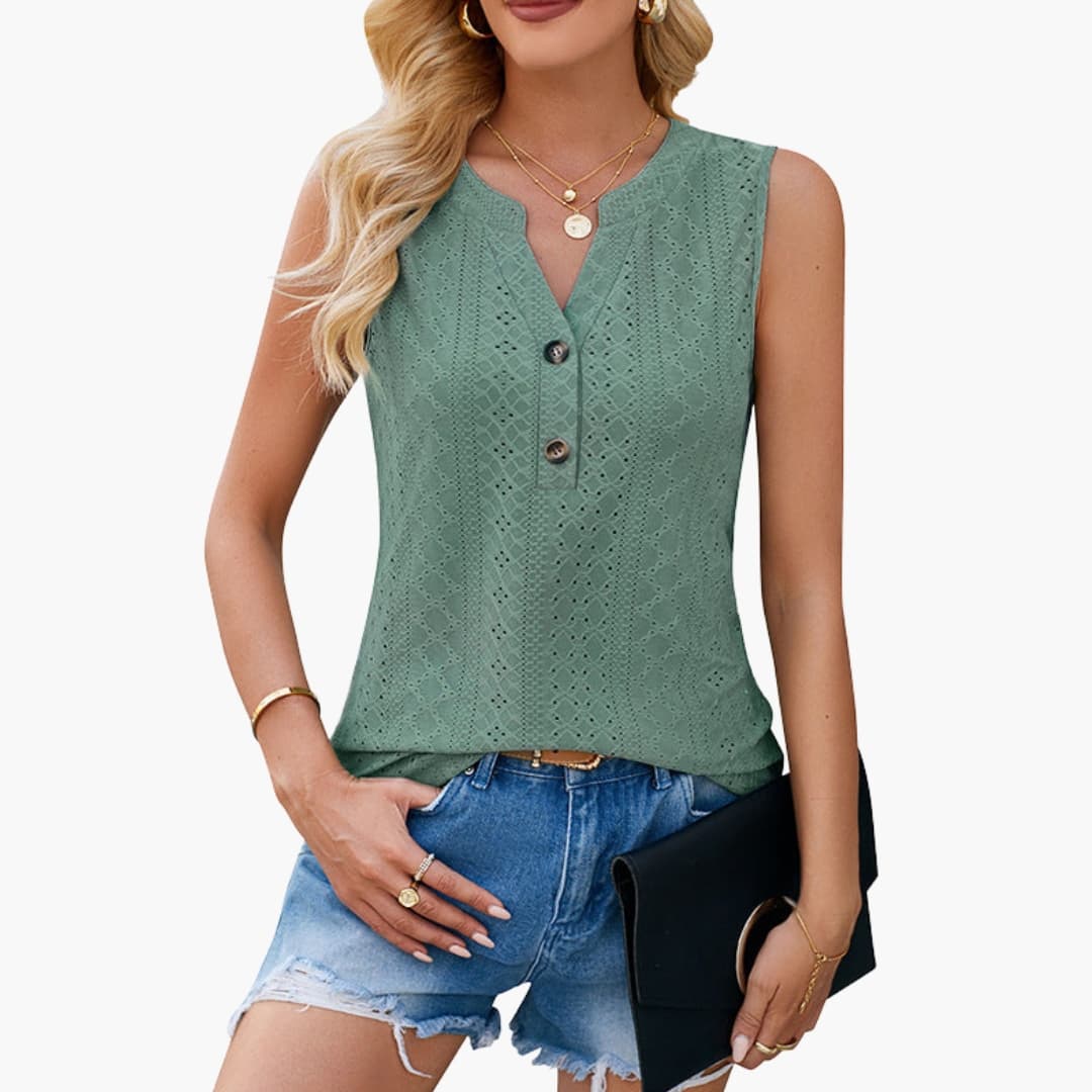 Sleeveless women's blouse featuring a V-neckline and eyelet pattern design